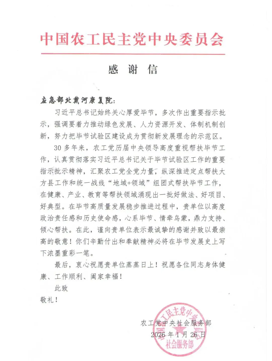 近日,中国农工民主党中央委员会向应急管理部北戴河康复院发出感谢信,对其长期以来倾力支持毕节建设发展表示衷心感谢并致以崇高敬意。感谢信指出,北戴河康复院以高度的政治责任感和历史使命感,心系毕节、情牵乌蒙,在尘肺病防治和职业健康帮扶等领域作出了积极贡献,其辛勤付出和奉献精神为毕节高质量发展增添了重要助力。