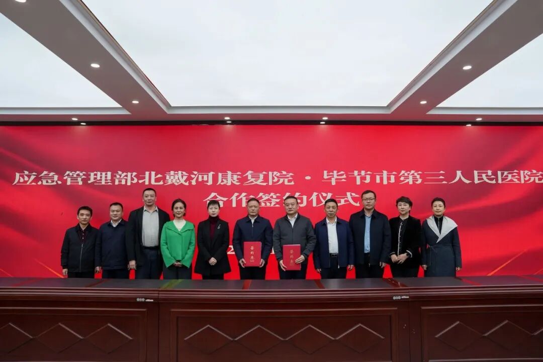 应急管理部北戴河康复院院长赵朝阳和毕节市第三人民医院院长李珍武代表双方签署了“大容量全肺灌洗技术帮扶及尘肺病专科共建协议”。