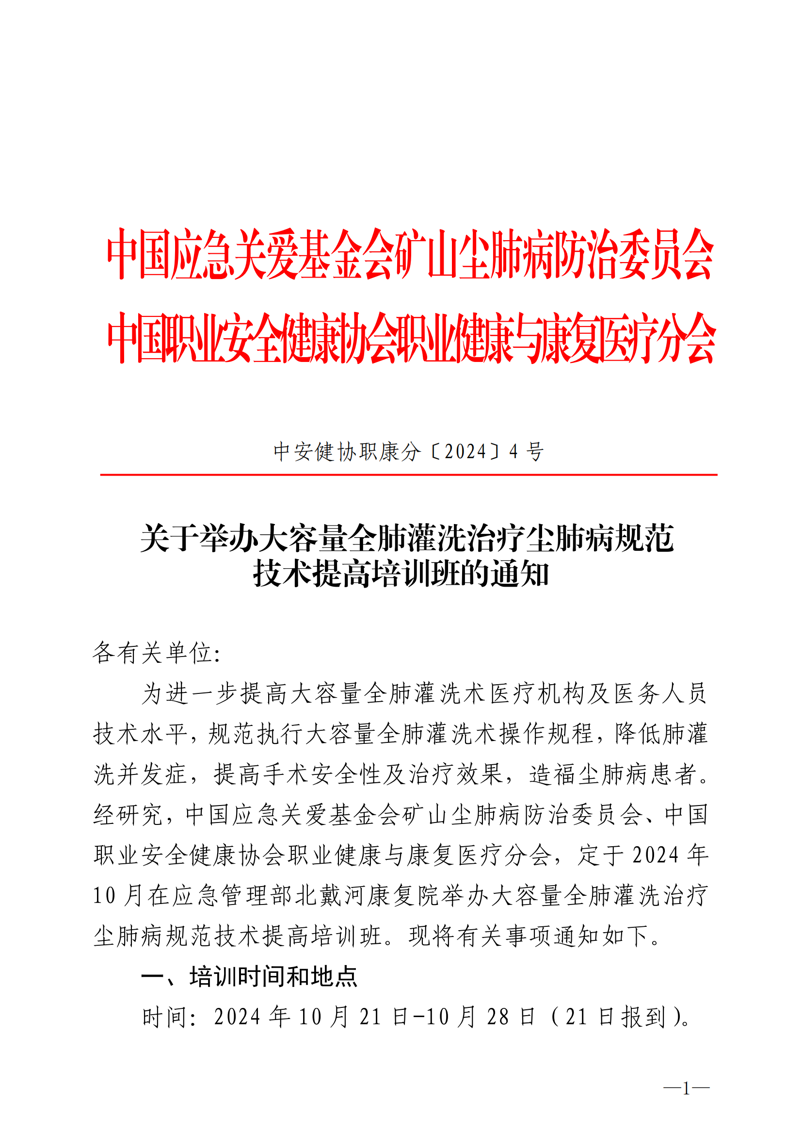 关于举办大容量全肺灌洗治疗尘肺病规范技术提高培训班的通知